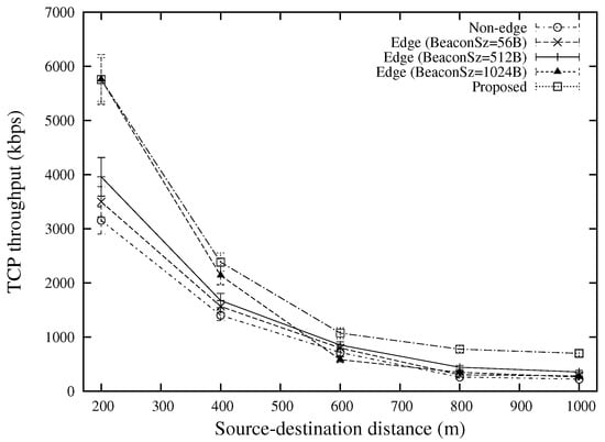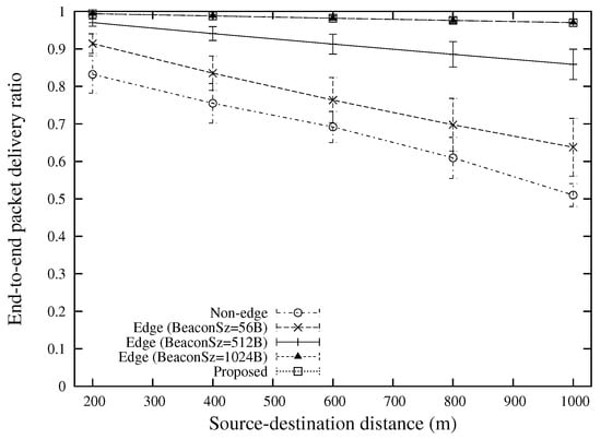 Figure 9 shows the end-to-end packet delivery ratio for various source-destination distances. All the edge-based approaches achieve significantly better performance than the conventional approach without edge computing. This is because the packet forwarding through the edge node could efficiently reduce the MAC layer contention by using smaller numbers of sender nodes, resulting in a better wireless resource utilization. When the beacon size is small (“Edge (BeaconSz = 56 B)”), it is difficult to achieve a high packet delivery ratio as the small size beacon overestimates the link quality. Since the proposed scheme uses different sizes of beacons for different requirements, the link quality is evaluated more accurately, and this contributes to a significant improvement of packet delivery ratio as compared with other approaches that use constant packet size for beacons.