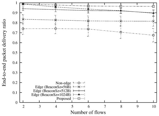 The end-to-end packet delivery ratio for different numbers of concurrent unicast traffic flows is shown in Figure 10. Although “Edge (BeaconSz = 1024 B)” is able to provide a high packet delivery ratio, the performance drops drastically with the number of traffic flows as a large size beacon underestimates the link quality, resulting in a large number of hops than the optimal one. The proposed scheme is able to attain a better performance in various number of traffic flows by selecting routes with consideration of packet payload sizes. Another contributor for the high packet delivery ratio is the edge-based packet forwarding approach which could reduce the number of forwarder nodes as compared with the conventional non-edge approaches.
