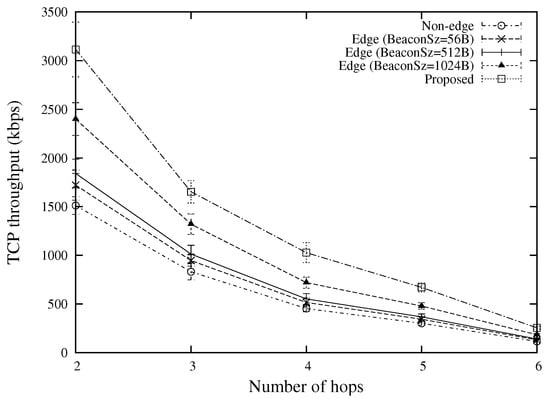 Figure 13 shows the TCP throughput for various numbers of hops. By using the virtual multi-hop data delivery, the proposed scheme can achieve more than 20 percent improvement over other approaches in all situations (“Edge (BeaconSz = 56 B)”, “Edge (BeaconSz = 512 B)”, and “Edge (BeaconSz = 1024 B)” do not use the virtual multi-hop data delivery). This is because the virtual multi-hop data delivery can result in a more efficient utilization of wireless resources by providing a higher congestion window size at each sender node as compared with the conventional end-to-end TCP approach.