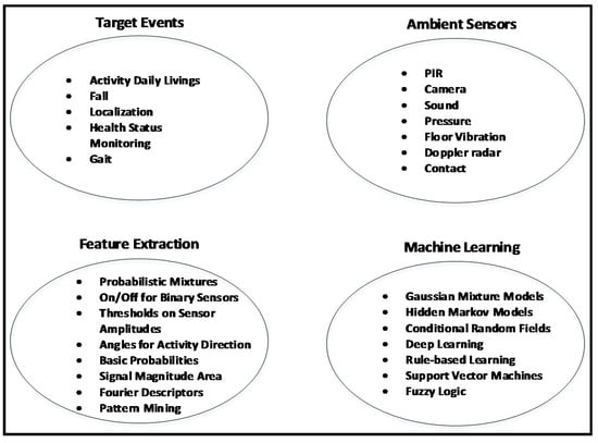 The ambient sensors that are used for elderly care can be placed in different locations in a smart home to monitor human behavior or health status. Figure 4 shows a sample schematic setup of a smart apartment for behavior monitoring of an elderly person based on different ambient sensors. Some frequently used sample sensors are shown in different places in the apartment. Other sensors can be installed, such as environmental sensors, for measuring temperature, humidity, etc. Figure 5 shows the major domains for ambient sensor-based elderly monitoring: target events, sensors, features, and machine learning.