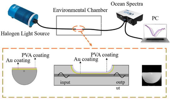 To investigate the response to RH, the fiber SPR sensor was placed in a homemade RH chamber, with one end connected with a halogen light source (400–2000 nm, Ocean Optics) and the other end connected with a fiber spectrometer (Ocean Optics), respectively, as shown in Figure 1. In the RH chamber, there was a humidifier and drier for increasing and decreasing RH, respectively, a fan for homogenization and stabilization, and an electric hygrometer for calibration. The RH could be controlled from 40% to 90% with an accuracy of 0.1%. The transmission spectra of the sensor were collected by the spectrometer and recorded and post-processed by a personal computer (PC) in real-time during the test. Meanwhile, the RH data collected by the electric hygrometer for calibration were also recorded by the PC simultaneously.