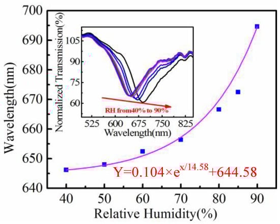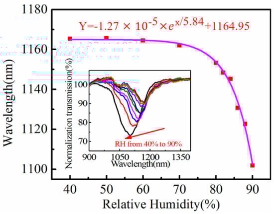 To verify this expectation, a sensor with an initial wavelength of 1165.29 nm is prepared and tested in the RH chamber. Resonant wavelengths of the sensor are plotted in Figure 5 with RH increasing from 40% to 90%. The resonant dip shifts monotonically towards shorter wavelengths with RH increasing, and can be fitted exponentially with an R-Square of 0.993, as shown in Figure 5. The sensor exhibits very high sensitivity in high RH environments, for example, the averaged sensitivity reaches 4.97 nm/RH% for environments with RH between 80% and 90%.