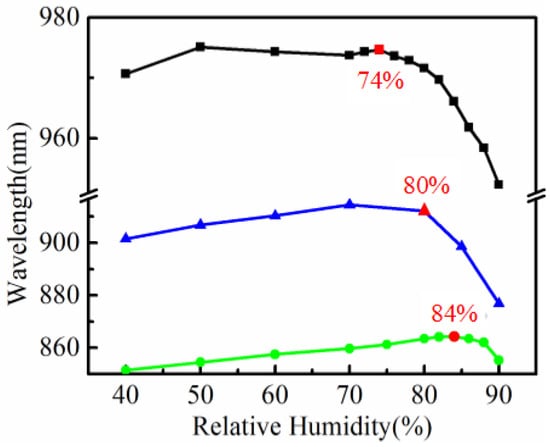 The appearance of an inflection point for a resonant wavelength shift of the fiber SPR sensor can be mainly attributed to the competition between the thickness expansion and RI reduction of the PVA film due to moisture absorption in the humidity atmosphere. As is well known, the swelling is notable for PVA films due to moisture absorption [], which will thicken the PVA film coated on the surface of the fiber SPR sensor and thus result in the redshift of the resonant wavelength of the sensor. Preliminary simulation results show that a 10 nm increment of the film-thickness may result in a resonant wavelength shift toward longer wavelengths for ~15 nm for a 100-nm-thick PVA film. On the other hand, the RI reduction of the PVA film due to moisture absorption may lead to the shift of the resonance toward shorter wavelengths []. Specifically, with the film-thickness increasing, the total shift of the resonant wavelength caused by this effect becomes gradually larger, from the order of tens to hundreds of nanometers. So PVA swelling may play a major role in the resonant wavelength shift for fiber SPR sensors with very thin PVA films, which typically exhibit an initial wavelength smaller than 850 nm. In these cases, the penetration depth of the evanescent field is larger than that of the thickness of the PVA film, and a notable fraction of light fields penetrate the film and propagate in the air nearby. For sensors with an initial wavelength larger than 850 nm, the fraction of evanescent fields that propagate in the air decreased, and the two phenomena of PVA film caused by moisture absorption may compete with each other and exhibit a balance at an appropriate point of RH, namely, an inflection point. The resonant wavelength shift is dominated by the film expansion before this inflection point, and then dominated by the RI reduction of the PVA film after this point. Experimental results shown in Figure 4 have proven the existence of the inflection points. It can also be seen from the figure that the inflection point moves to lower RH values with the initial increases in wavelength. And it can be expected that the effect of RI reduction will fully overcome that of the thickness expansion of the PVA film with a further increase to the film thickness, or the initial wavelength of the fiber SPR sensor [].