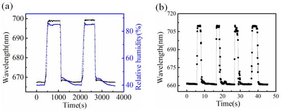 The monitoring of relative humidity (RH) of the environment around the analyte is critical in a variety of situations such as food fabrication, medical research, agricultural production, weather prediction, and air quality monitoring. Therefore, the design of a highly sensitive RH sensor is of great interest and has been developed continuously in the applications mentioned above. Compared to a traditional electric RH sensor, optical fiber-based sensors exhibit a great number of advantages, such as security to the human body, miniaturization for integration, and good resistance to electromagnetic interference. In recent years, a variety of fiber devices have been implemented in to the design of optical fiber RH sensors, configurations including interferometers [,,,,,,], long period fiber gratings [,], tapered fibers [,,,], fiber Bragg gratings (FBGs) [,,,,], mode couplers [,], ZnO nanostructures [,], evanescent wave absorption structures [,], and so on. Among these configurations, light intensity demodulation is often used since it is simple and cost effective. For example, Y. Miao et al. have demonstrated a RH sensor based on a polyvinyl alcohol (PVA) coated tilted FBG, of which the sensitivities are 2.52 and 14.95 dBm/RH% under RH of 20–74% and 74–98%, respectively []. However, the stability and accuracy of intensity demodulation techniques are generally disturbed by system noises and the fluctuation of light source. Thus, there are also choices that utilizing wavelength demodulation techniques to overcome the problems existed in intensity demodulations.