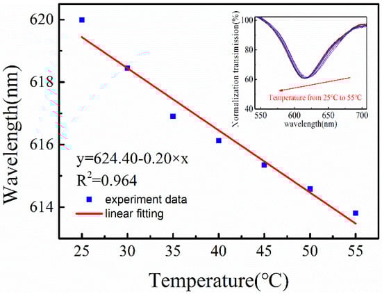 The temperature response is shown in Figure 7. When the environmental temperature increases from 25 °C to 55 °C, the SPR wavelength shifts from 619.99 nm to 613.81 nm. A temperature sensitivity of 0.20 nm/°C can be obtained through linear fitting of the experiment data with R-square of 0.964. Accordingly, the temperature induced cross-sensitive can be calculated to be 0.2 RH%/°C.
