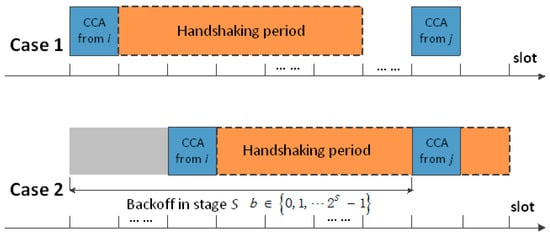 According to the content of the slotted CSMA/CA algorithm, before transmission, the sensor node should perform the CCA process to check whether the channel is idle or not. If the channel is busy, it will back off for a random number of aUnitBackoffPeriod and before checking again. Nodes can avoid the failure of CCA to some extent, with the assistance of backoff. A larger NB offers more chances for CCA. A larger BE offers nodes more backoff delay options, which enlarges the disparity in the backoff duration among nodes to decrease the probability of CCA failure. The IEEE 802.15.4 slotted CSMA/CA algorithm bounds the value of the backoff exponent between macMinBE to macMaxBE. . It should be noted that the maximum value allowed for by the IEEE 802.15.4 standard is equal to 8 []. Hence, the probability of successfully passing CCA is affected by and . Assuming that all data packets are of the same packet size, they correspond to occupying the same channel time of slots. For each sensor node, successful CCAs on its targeted channel mainly happen in two cases, as shown in Figure 1.