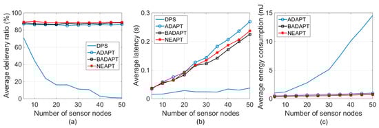 The average packet delivery ratio of NEAPT is always higher than ADAPT and BADAPT, according to the results presented in Figure 3a. Although the style of parameter tuning that NEAPT provides is conservative and inflexible, Figure 3b shows that NEAPT had almost the same performance as BADAPT, in terms of latency—especially in networks with no more than 25 nodes. The average latency of taking NEAPT was always lower than taking ADAPT. Moreover, considering energy consumption, adopting NEAPT could save 9.72% of the energy consumption than if adopting BADAPT. Compared with ADAPT, adopting NEAPT could save 16.53% of the energy consumption. This additional improvement is mainly benefited from not using ACKs.
