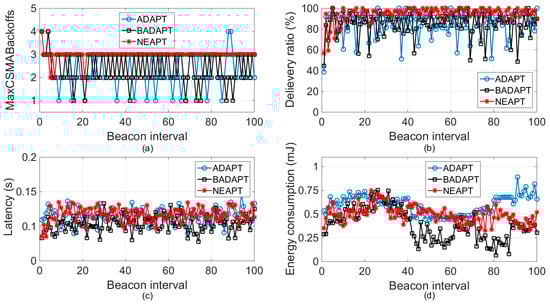 An experiment with 25 active sensor nodes was performed to gain a more concrete understanding of NEAPT. This experiment was also in a stationary condition and its execution time was 100 BIs. We focused on 1 of 25 sensor nodes and recorded its observable performance as well as its value of macMaxCSMABackoffs. As shown in Figure 4a, the value of macMaxCSMABackoffs with NEAPT always equaled to 3. Whereas with ADAPT and BADAPT, the value of macMaxCSMABackoffs changed very frequently. More specifically, within the considered 100 BIs, the total number of fluctuations for NEAPT was 7. While for ADAPT and BADAPT, the total number of fluctuations were 70 and 81, respectively, which is 10 times and 11.57 times, respectively, that of NEAPT. However, Figure 4b indicates that NEAPT could provide higher and steadier reliability performances than the other two algorithms. By combining Figure 4a and Figure 4b, we can find that NEAPT was able to avoid more unnecessary tuning than ADAPT and BADAPT. This is due to the conservative evaluation of the local network condition analysis and network node equalization that NEAPT provides. Similarly, Figure 4c,d also shows that NEAPT had a more adequate and steadier performance, in terms of energy consumption and time efficiency, than the other two algorithms. The mean value and variation of transmission latency that ADAPT and BADAPT provided were (131.406 ms, 0.557 ms) and (116.552 ms, 0.483 ms), separately. By adopting NEAPT, the mean value and variation of transmission latency were 107.72 ms and 0.403 ms, which was lower than ADAPT by 22.04% and 38% (and for BADAPT, 8.20% and 19.85%). Considering the randomness of CSMA/CA and the time varying characteristics of the wireless channel, this conservative and inflexible parameter tuning algorithm can protect the sensor nodes from being disturbed by tiny fluctuations of the packet delivery ratio.