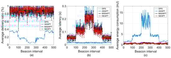 The results presented in Figure 5 refer to one of ten sensor nodes that were always active. Figure 5a shows that the reliability of the DPS was always below 40%, whereas the delivery ratios of ADAPT, BADAPT, and NEAPT were above 80% most of the time. Throughout the entire 500 BI simulation, the ratio of failing to meet the reliability requirement with NEAPT was 5.6%. For ADAPT and BADAPT, their ratios were 21.2% and 17.4%, respectively. It should be noted that the packet delivery ratio of ADAPT and BADAPT decreased sharply at the 101st and the 201st BI due to the sudden change of network condition. In detail, for ADAPT, we observe that the packet delivery ratios at two sudden changes were 42% and 53%. And the recovery time after each sudden change was around 7 BIs. As for BADAPT, we find the packet delivery ratios of two sudden changes were 36% and 58% and the recovery time was also around 7 BIs. While for NEAPT, no such serious packet delivery ratio decrease occurred throughout the entire simulation. The recovery time after each sudden change was around 5 BIs, which is lower than the recovery time of ADAPT and BADAPT. This is mainly due to the conservative parameter tuning method of NEAPT. These results show that NEAPT has better robustness than ADAPT and BADAPT under dynamic conditions. From Figure 5b,c, it is shown that ADAPT and BADAPT experienced almost the same energy consumption and latency performance under dynamic conditions. What’s more, it is also shown that NEAPT was able to provide a steadier performance under dynamic conditions, in terms of transmission latency and energy consumption, than ADAPT and BADAPT. This result not only proves the ability of NEAPT in providing qualified and steady performance in dynamic conditions, but also presents its advantage of conservative parameter tuning in buffering sudden changes of network condition.