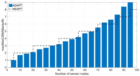 A series of experiments were performed to specify the application range of the proposed NEAPT on a network scale. Within these experiments, the required packet delivery ratio was fixed at 80%. The time interval of each sensor node’s successive data packet ranged from 3 s to 7 s. The scale of the network ranged from 5 nodes to 95 nodes. Simulations with different network scales were separately executed over 100 BIs. In these simulation experiments, the sensor nodes first adopted ADAPT as their parameter tuning algorithm. After each experiment, values of macMaxCSMABackoffs that satisfied the reliability requirement were collected. The average value of each experiment’s collected values were calculated and recorded. Then, under the different network scales, the suggested values of macMaxCSMABackoffs by NEAPT were analytically obtained and recorded.