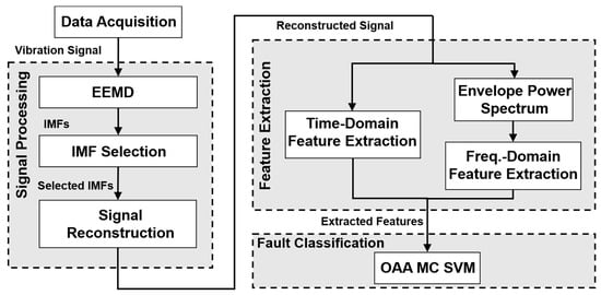 The block diagram of the proposed rub-impact fault diagnosis framework is presented in Figure 1. The proposed approach consists of four essential steps: data acquisition, signal processing, feature extraction, and fault classification. As shown in Figure 1, after data acquisition, an unknown vibration signal is first decomposed into a finite number of oscillating components by EEMD. Then, the subset of IMFs that are signal-dominant and carry essential information about the rubbing faults is selected using the proposed adaptive selection procedure with our novel IMF evaluation metric. Next, time- and frequency-domain features are extracted from the signal reconstructed using the selected IMFs, which represents a clear rub-impact fault signal. This set of hybrid features can provide sufficient insight into the rubbing process to classify rubbing faults of various intensities. The fault diagnosis procedure is completed by means of a one-against-all multi-class support vector machine (OAA MC SVM) classifier [,].