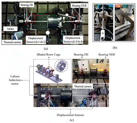 The self-designed test rig for rub-impact fault diagnosis: (a) the overall view of the testbed; (b) the device used to create shaft imbalance; and (c) simplified component view. DE, drive end; NDE, non-drive end.