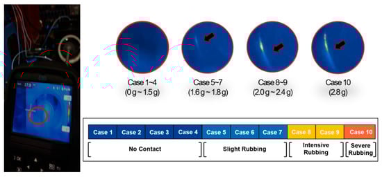 A rub-impact fault was simulated by adding extra weight on the NDE to create a shaft imbalance. This imbalance in the shaft caused local interactions between the rotor blades and the stationary part. The appearance and intensity of the rubbing process were validated using a thermal camera mounted on the NDE of the shaft. Adjusting the extra mass at the end of the shaft resulted in various rubbing intensities as shown in Figure 3. The total duration of the recorded signal for each case was 59 s. However, each signal was divided into slices of 1 s each for signal processing and feature extraction.