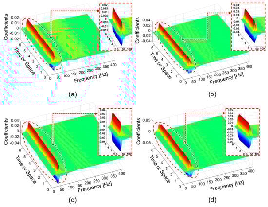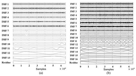 EMD [] decomposes the original signal  into a finite number of oscillatory components using a sifting process. In order to be defined as an IMF, the function should meet the following two conditions [,]: (i) the number of extrema and zero-intersect points are either equal to each other or differ by at most one; and (ii) at any point, the mean of the envelopes defined by local maxima and minima is equal to zero. Each IMF can be considered as a specific frequency band of the original signal, where the first IMFs represent high-frequency bands and the last IMFs correspond to lower frequency bands [].
