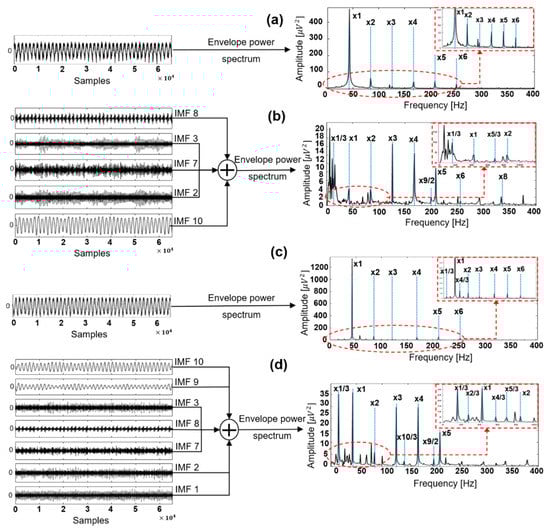 Envelope power spectra of (a) class ‘0 g’ original signal; (b) reconstructed signal using selected IMFs for class ‘0 g’; (c) class ‘2.8 g’ original signal; and (d) reconstructed signal using selected IMFs for class ‘2.8 g’.
