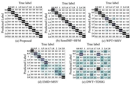 Confusion matrices for the proposed framework and the reference methods are presented in Figure 9. The confusion matrix is a robust technique that provides a visualization of the performance of a classifier algorithm in terms of the deviation between actual and predicted results []. According to the results in Figure 9a, the proposed method perfectly identified rubbing faults of all intensities with a very low misclassification rate compared to its counterparts: SensIMF + HFM [] in Figure 9b, WPT + MSV [] in Figure 9c, EMD + MSV [] in Figure 9d, and WT + TDSIG [] in Figure 9e.