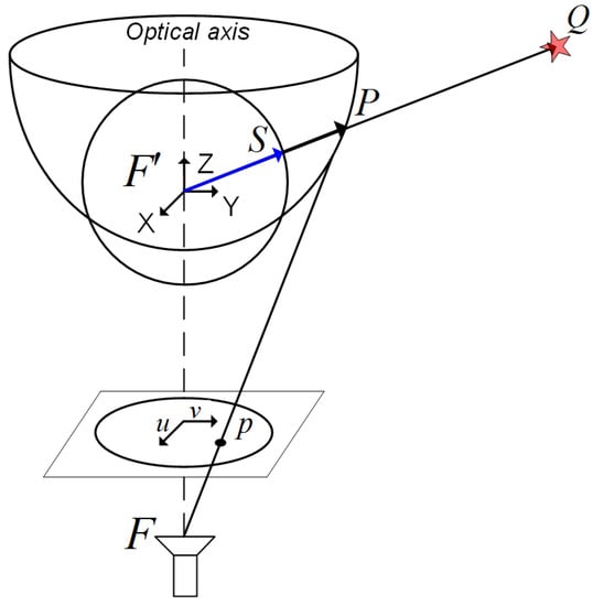 According to [], the projection model of our omnidirectional camera can be posed in terms of a central sphere projection system. Figure 2 reproduces the omnidirectional image generation in terms of such a projection, where a 3D scene point, , is projected onto the mirror surface as P, onto the unitary sphere as S, and onto the camera plane as . The focals of the hyperbolic mirror are F and , F being coincident with the optical center of the CCD camera, whose optical axis lies in the Z-axis. Notice that the central sphere unifies the notation of the projection vectors for normalization purposes, according to the calibration of the omnidirectional camera [], regardless of the characteristics of the mirror and its non-linearities. Thus the mapping of a 3D point onto the image plane can be analytically expressed as follows []: