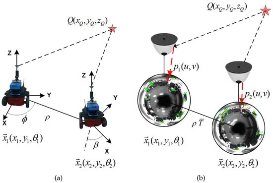 Omnidirectional visual localization between poses and . (a) a 3D point is observed from the robot reference system; (b) additionally, the projections of Q, , and are presented onto the camera reference system.