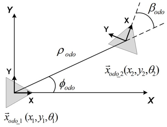 The odometer provides readings (), which permit obtaining a relationship between two consecutive 2D poses traversed by the robot, expressed in the odometer’s notation as and , being the orientation. As it may be observed in Figure 4, the relation between poses can be stated as follows: