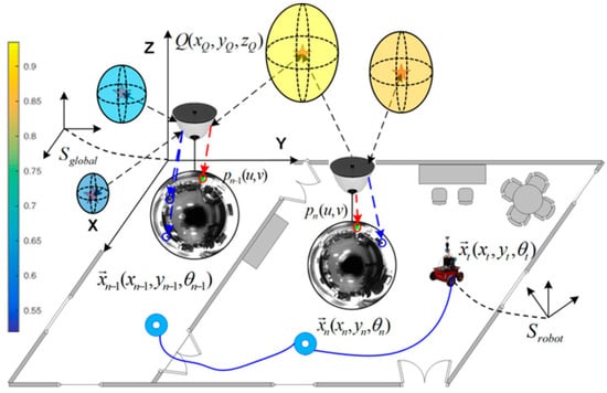 Robot navigation example in an office-like scenario along three poses: , , and . The 3D probability distribution of feature points’ existence permits associating visual feature points with a specific probability, indicated with colored spheres, whose probability values are encoded according to the left-side colorbar. Projections of a 3D point , and , are also indicated. The 3D global reference system is denoted as , and the 3D robot reference system as .
