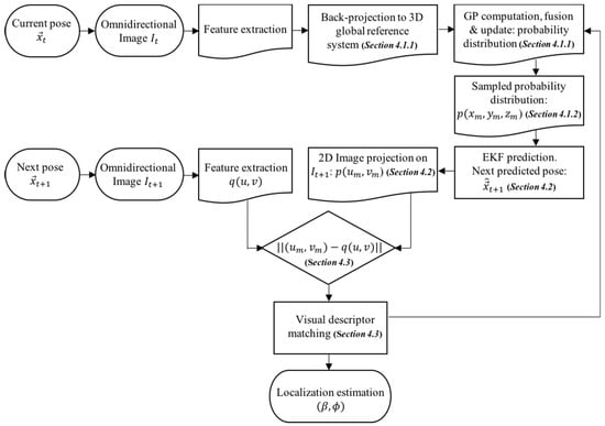 A general overview of the entire process can be observed in Figure 6. The main contributions, which try to obtain a probability-oriented feature matching, are present in the following blocks: the 3D back-projection, the GP computation to produce the 3D probability distribution, the probability sampling, and the 2D image projection over the next predicted pose.