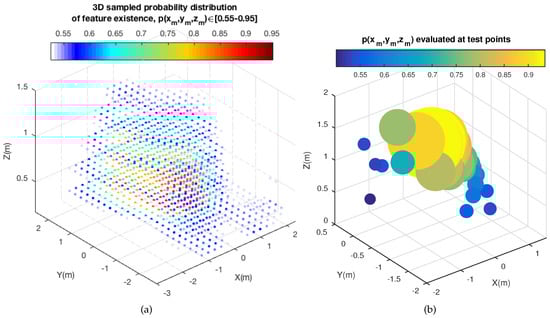 3D sampled probability distribution of feature existence. (a) Complete 3D sampled probability distribution, ; (b) evaluated at the last feature points observed (test points).