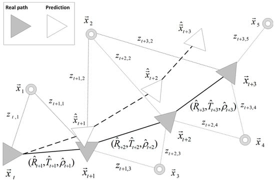 where and are the standard deviations that characterize the proposed localization method described in Section 3. Figure 8 synthesizes the motion prediction process, where represents the observation measurement of a certain view in the environment, , computed from the current pose, , as described in Equations (13) and (14).