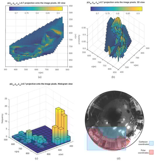 Finally, the 3D probability distribution is projected onto the pixels of the 2D image frame associated with the next pose of the robot, denoted as , by applying Equation (1). Furthermore, a specific probability range with custom values can be defined, [–], in order to only select points from the distribution with probabilities within that range. The immediate outcome is the generation of probability areas in the image frame, where feature matching is more likely to appear. Figure 9 presents a real example after applying the overall method to the image acquired from the current robot pose. The visualized probability range is [0.7–1]. Figure 9a represents the projection of onto the image plane, as in 2D, and Figure 9b in 3D. Figure 9c presents the same 2D projection after transforming the axes in order to generate a histogram representation. This last representation is useful for data processing tasks. Finally, Figure 9d reveals that polar space encoding might produce a better modeling of the distribution rather than Cartesian coordinates. This may be implicitly induced from the elliptical constitution of the epipolar curves in an omnidirectional vision system.
