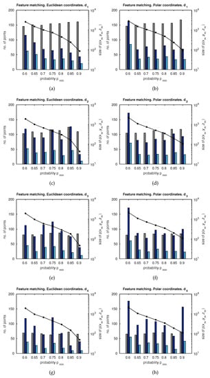 Figure 11 presents matching results with different configurations. The X-axis represents the minimum range for the probability of feature existence, . The distance between consecutive poses has been considered a variable parameter ( to ), being meters, and the influence of this distance was tested. The left-side Y-axis represents the number of features obtained by a standard matching technique [] (grey), the proposed matching candidates (dark blue), and the final number of matches of the proposed approach (light blue). The right-side Y-axis () represents the size of <. Additionally, the influence of using either Euclidean coordinates (left column) or polar coordinates (right column) was assessed.
