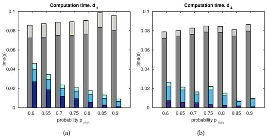 Computation time versus . (a) Distance ; (b) distance . Legend: ■ standard matching: matching computation; ■ standard matching: localization computation; ■ proposed matching: candidates’ computation; ■ proposed matching: matching computation; ■ proposed matching: localization computation.