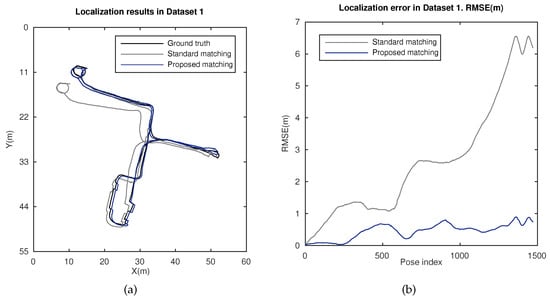 This section deals with the localization estimation, produced by this approach. Figure 14 presents localization results for the dataset. Figure 14a shows a bird’s eye view of the estimated poses (plane , meters). Estimations obtained with the standard matching [,] and the proposed matching are compared. Figure 14b carries out the same comparison in terms of the root mean square error (RMSE), for both approaches. It can be observed that our proposal outperforms the localization method with standard matching and is capable of ensuring a bounded error at every t, in contrast to the standard method error, which increases substantially with t. These results validate the design of this approach and its performance, according to the previous subsection.