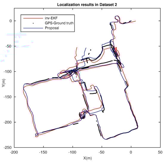 In addition to the previous localization results, we compared our method with a widely recognized approach, the inverse EKF with depth parametrization []. To that end, we used the benchmark toolkit, publicly available in [], and which also provides Dataset 2, Bovisa 2008-10-04. The results generated by the inverse EKF technique can be further consulted in [,]. Figure 15 presents localization results in a very challenging outdoor scenario, where dynamic conditions are highly relevant and challenging. Localization estimation results for the inverse EKF (red), the proposal (blue), and the zones where ground data (GPS) are available (black) are depicted. At first inspection, our approach demonstrates an improved reliability.