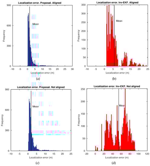 Localization error histograms in Dataset 2, Bovisa 10-04-2008. (a) Proposed approach with alignment enabled. (b) Inverse EKF approach with alignment enabled. (c) Proposed approach with alignment disabled. (d) Inverse EKF approach with alignment disabled.
