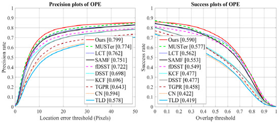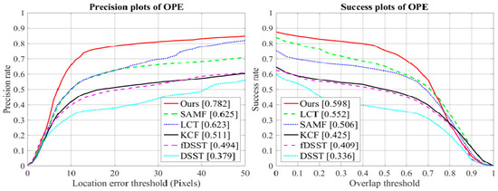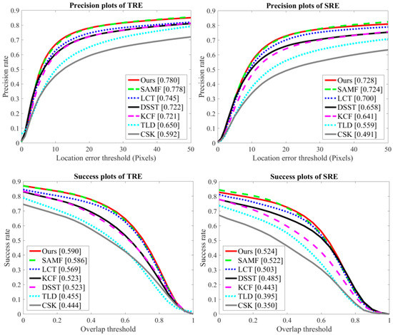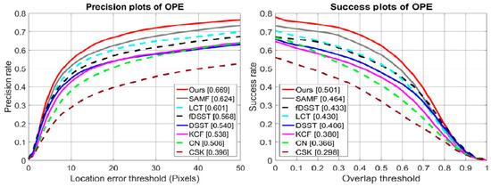 - Lukežič, A.; Vojir, T.; Zajc, L.Č.; Matas, J.; Kristan, M. Discriminative Correlation Filter with Channel and Spatial Reliability. In Proceedings of the IEEE Conference on Computer Vision and Pattern Recognition (CVPR), Honolulu, HI, USA, 21–26 July 2017; pp. 6309–6318. [Google Scholar]