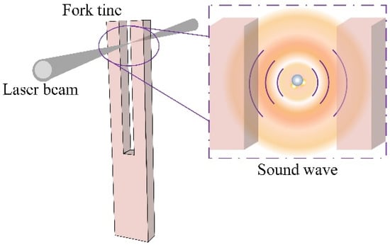 Figure 1. The schematic diagram of a quartz tuning fork (QTF), the laser excitation beam, and the generated sound wave.