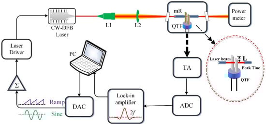 The performance of a QEPAS sensor system is correlated with the measured signal value. Therefore, it is necessary to maximize the signal. An improvement of the QEPAS signal can be achieved by an increase in optical excitation power. In Ma et al. [9], a quantum cascade laser (QCL) was used as the excitation because the output power can reach ~1000 mW. An erbium-doped fiber amplifier (EDFA) with an output power of ~1200 mW was utilized to amplify the output laser in Wu et al. and Ma et al. [10,11]. In Lassen et al. [12], an off-beam QEPAS sensor using a pulsed nanosecond mid-infrared optical parametric oscillator with an average output power of approximately 400 mW was demonstrated. Additionally, an optimization of the dimensions of the QTF and the structure of the acoustic detection module could also improve QEPAS sensor performance [13,14,15,16,17].