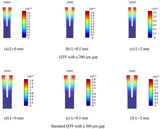 Figure 3. Calculated deformation with various acoustic wave excitation positions (L) for two different QTFs: (ac) for the QTF with a 200 μm gap; (df) for the standard QTF with a 300 μm gap.