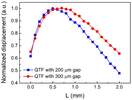 The simulated QEPAS normalized displacement with various values of L for two different QTFs is shown in Figure 4. The calculated range was 0–2 mm with a 0.1 mm step size. As the diode laser beam moved down relative to the QTF, the normalized signal amplitude increased rapidly in the range of 0–0.5 mm and kept decreasing within the range of 0.5–2 mm for the QTF with a 200 μm gap. The optimum vertical position was L = 0.5 mm based on the simulated results. For the standard QTF with a 300 μm gap, the optimum vertical position L was 0.7 mm. The calculated maximum displacement for the small-gap QTF with 200 µm gap and the standard QTF with 300 µm gap were 1.96 × 10−10 mm and 1.82 × 10−10 mm, respectively.