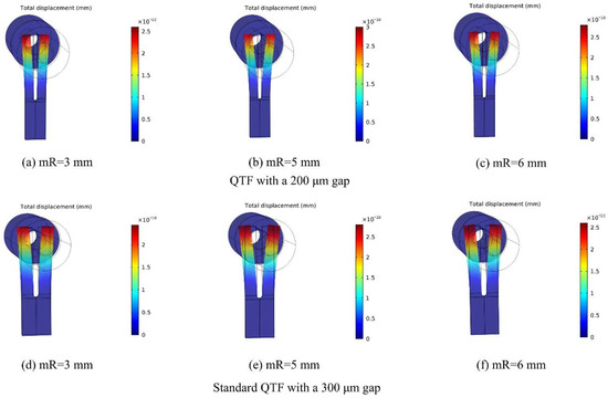 Figure 5. Calculated displacement with various micro-resonators (mRs) for two different QTFs: (ac) for the QTF with a 200 μm gap; (df) for the standard QTF with a 300 μm gap.