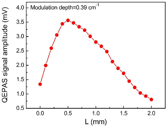 As mentioned above, water vapor (H2O) was selected as the target analyte and a QTF with a small-gap of 200 μm was adopted. The acoustic wave excitation position generated by the diode laser beam was optimized experimentally and the result is shown in Figure 7. The experiment was carried out with a laser wavelength modulation depth of 0.39 cm−1. The experimental results were often identical to the FEM simulations and the optimal position of L for the maximal signal amplitude was found to be 0.5 mm. Therefore, in the following experiments L = 0.5 mm was chosen.