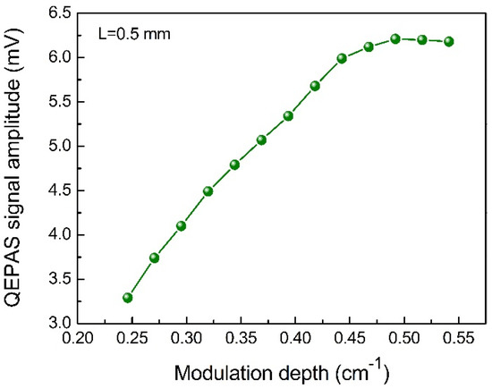 An optimization of the modulation depth was implemented to improve the 2f signal level. The laser modulation was completed by adding a voltage ramp with low frequency and a sinusoidal signal with a frequency of f0/2. The experimental results are shown in Figure 8. When the modulation depth was small, the modulation amplitude fell short of covering the H2O absorption line. Therefore, the QEPAS signal amplitude was weak. The H2O-QEPAS signal level increased with an increase of the modulation depth. The curve declined when the modulation depth was greater than 0.49 cm−1. Ultimately, the optimum modulation depth was determined to be 0.49 cm−1.