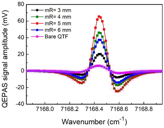The range of 2.8~5.5 mm was the optimum length of the mR tubes, as mentioned before. The 2f signal measured following the addition of mRs of different lengths at the optimum modulation depth of 0.49 cm−1 is shown in Figure 9. The maximum signal level was achieved when the mR tubes with a length of 5.0 mm were used, followed by the lengths of 4 mm, 6 mm, and 3 mm. These results were consistent with those of the simulation. The maximal signal of 65.6 mV achieved an 11-fold amplification when compared to the signal generated by the bare small-gap QTF. The noise value was 29.6 μV, which was obtained by taking the standard deviation of signal points distant from the absorption peak. The integration time for the noise determination was the same as the signal measurement. With a water vapor concentration of 0.296% (with air temperature at ~13 °C), the minimum detection limit (MDL), which represents the detection performance of sensor, was calculated to be 1.3 parts per million (ppm). The calculated normalized noise equivalent absorption coefficient (NNEA) was 1.42 × 108 cm1W/√Hz.