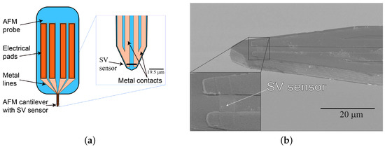 Integration of the sensor in the AFM probe. Schematic of the probe chip (a), scanning electron microscopy image of the cantilever tip with the integrated SV sensor (b).