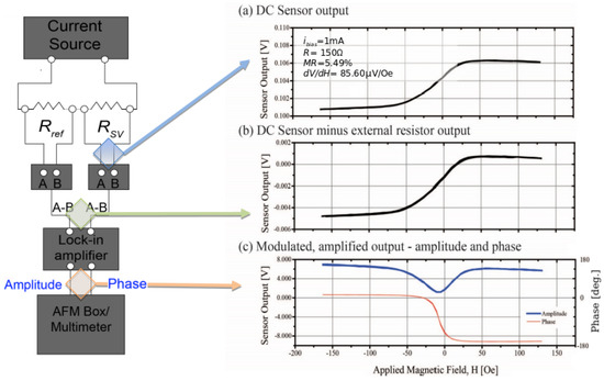 Effects of the electronic setup on the magnetoresistive signal under uniform magnetic field. Left: electrical circuit processing the signal measured by the SV sensor. Right: (a) magnetoresistive transfer curve at 1 mA bias current; (b) DC offset removal by tunable reference resistor before feeding into lock-in amplifier; (c) signal demodulated by the lock-in amplifier set at bias current frequency.