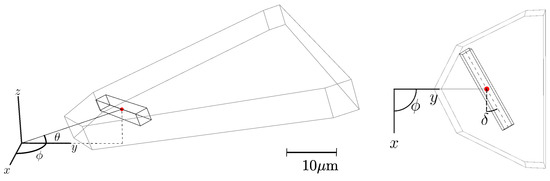 The model is focused on replicating the response of a field sensor according to its physical properties during the measurement. Therefore, the initial concern was to provide a set of degrees of freedom that allowed to position the sensor correctly in space, as demonstrated in Figure 4. From the fabrication conditions, the offset of the central point of the sensor towards cantilever tip was d = 11.4 m along the cantilever long axis, with the sensor long axis placed transverse to the long axis of the cantilever (). The tilt of the cantilever towards the sample plane is . The polar angle is left free and will be the coordinate that determines the different measurement orientations necessary for the deconvolution of measured magnetic field intensities into the Cartesian components of the laboratory frame.