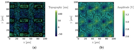 All measurements were performed in contact mode with topography and magnetic field intensity being recorded simultaneously. An example of measured topography and uncalibrated magnetic field intensity data is shown in Figure 5. Both images were linewise leveled to remove fluctuations of the set point in the AFM upon line changes. We can see the rectangular ferromagnetic features with a well defined height in the topography data and the corresponding magnetic field image patterns. The measurement noise of a calibrated magnetic image was estimated to lie between 5% and 10% of the measured signal amplitude by using a bilateral filter as explained in Appendix A. The vertical offset between the center of each figure in topography and amplified sensor signal is caused by the offset of the sensor towards the AFM tip.