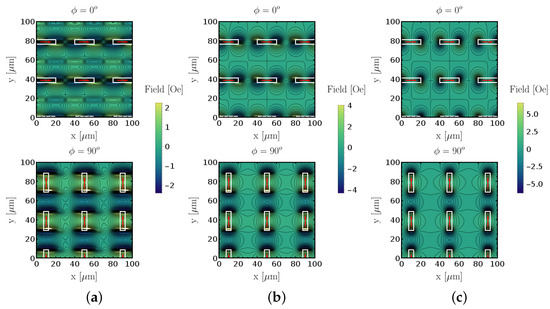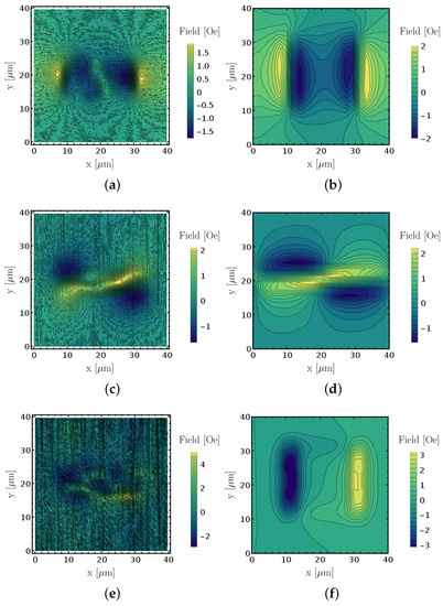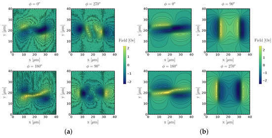 Following these notes, the data used for magnetic field reconstruction are presented in Figure 7. Applying Equation (2), we can now deconvolve the respective , where corresponds to the applied stage rotation, and thus solve the system of equations to determine , and for each point in space, meaning that in total the linear system was solved = 65,536 times. This value corresponds to the total number pixels in each scan. To increase the computational speed of the reconstruction algorithm, the linear system solver was computed in parallel on the CPU.