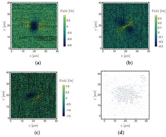 To provide an estimation of noise, it is necessary to separate it from the signal. Our strategy relies on applying a bilateral filter from image processing, which has the properties to be a nonlinear edge preserving type of filter for signal smoothing. In Figure A1, we show the result of applying such a filter on the measured data (Figure A1a) of a features scan at . The result is shown in Figure A1b, where a significant reduction of noise is visible. Figure A1c is the subtraction of the original measurement scan from the filtered data at each pixel and is expected to be the noise component of the signal when considering that the filter was able to track the signal. However, we can see that, especially on the regions of magnetic field patterns of the features, artifacts from the original signal are visible. If we take into account that these artifacts also appear to contribute to the largest recorded amplitude in Figure A1c, our best estimation points to a measurement noise level of around 5–10%.