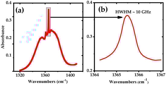 Simulated spectrum using the PNNL 2014 database, for 50 ppmv mixture of acetone in nitrogen (effective path length of 76 m, pressure 100 mbar and temperature 298K). (a) Broadband absorption spectrum of acetone and (b) narrowband spectrum of the Q-branch peak of acetone at 1365 cm−1.