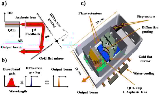 (a) A sketch of the Littrow configuration used in the EC-QCL design; (b) controlling the emission wavelength of the broadband gain QCL chip by the diffraction grating; (c) three-dimensional design of the laser housing, where thermoelectrically cooled Fabry–Pérot QCL gain chip is mounted vertically on a copper block together with three-dimensional adjustable aspheric lens.